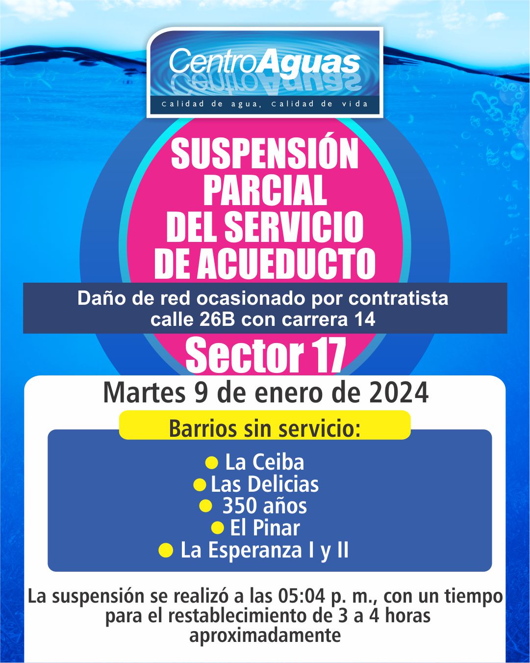 Suspensión parcial en el sector 17 por daño de red Escrito por Comunicaciones Centroaguas. Publicado en Noticias Frescas Anterior Siguiente