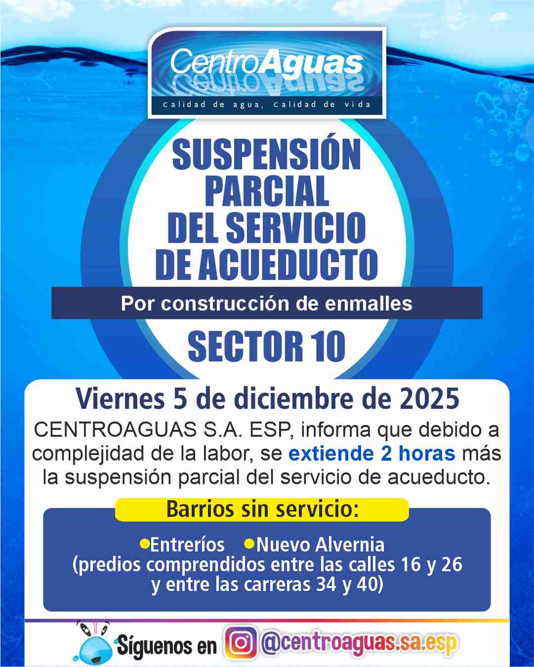 Se extiende el tiempo de suspensión parcial del servicio de acueducto del sector 10 Escrito por Comunicaciones Centroaguas. Publicado en Noticias Frescas Siguiente